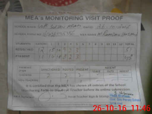 | Attendance Register | Head Teacher | MEA with School | Visit Proof |