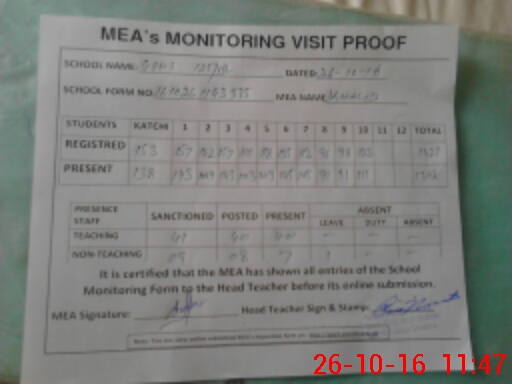 | Attendance Register | Head Teacher | MEA with School | Visit Proof |