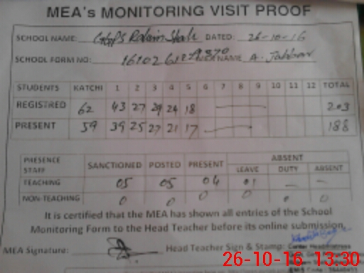 | Attendance Register | Head Teacher | MEA with School | Visit Proof |