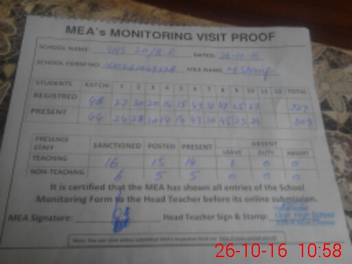 | Attendance Register | Head Teacher | MEA with School | Visit Proof |