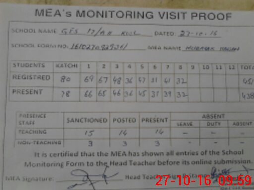 | Attendance Register | Head Teacher | MEA with School | Visit Proof |