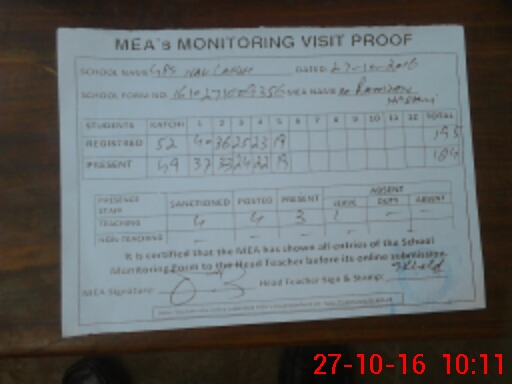 | Attendance Register | Head Teacher | MEA with School | Visit Proof |