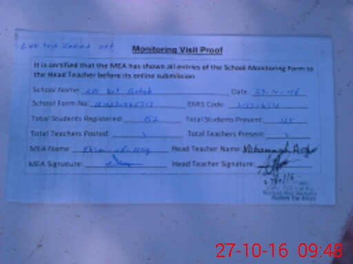 | Attendance Register | Head Teacher | MEA with School | Visit Proof |