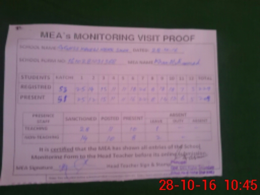 | Attendance Register | Head Teacher | MEA with School | Visit Proof |