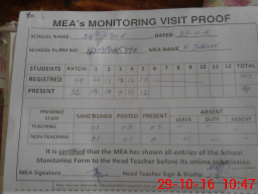 | Attendance Register | Head Teacher | MEA with School | Visit Proof |