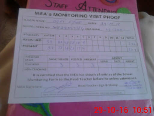 | Attendance Register | Head Teacher | MEA with School | Visit Proof |