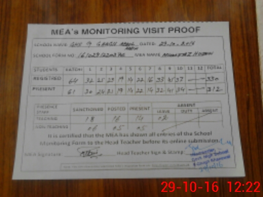 | Attendance Register | Head Teacher | MEA with School | Visit Proof |