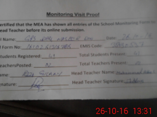 | Attendance Register | Head Teacher | MEA with School | Visit Proof |