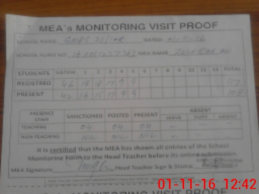 | Attendance Register | Head Teacher | MEA with School | Visit Proof |