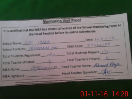 | School Visited by School Health & Nutrition Supervisor (No. of Visits) | 1 | Name1: | MUSHTAQ AHMED | Name2: | |