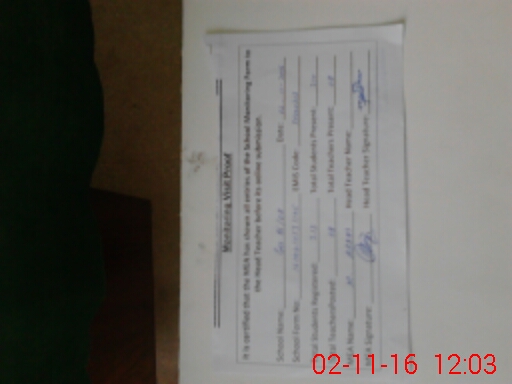 | School Visited by School Health & Nutrition Supervisor (No. of Visits) | 1 | Name1: | TAHERA MUBIN | Name2: | NIL |