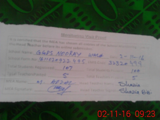 | EMIS Code: 32320499 | Name of School: GGPS NOORAY WALA | |||