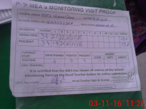 | Attendance Register | Head Teacher | MEA with School | Visit Proof |