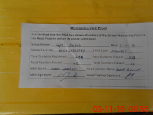 | Attendance Register | Head Teacher | MEA with School | Visit Proof |