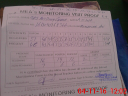 | Attendance Register | Head Teacher | MEA with School | Visit Proof |