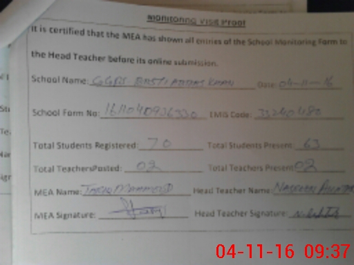 | Attendance Register | Head Teacher | MEA with School | Visit Proof |