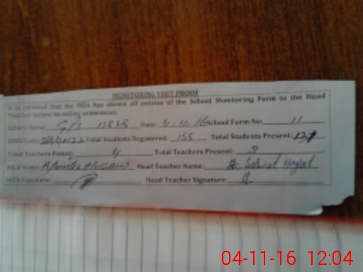 | Attendance Register | Head Teacher | MEA with School | Visit Proof |