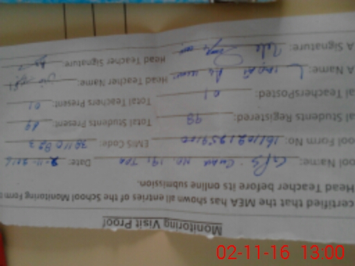 | Attendance Register | Head Teacher | MEA with School | Visit Proof |