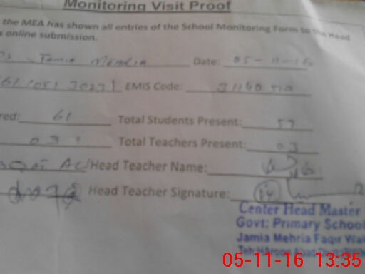 | Attendance Register | Head Teacher | MEA with School | Visit Proof |