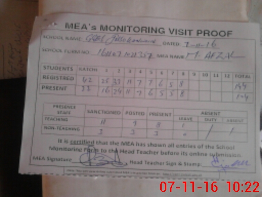 | Attendance Register | Head Teacher | MEA with School | Visit Proof |