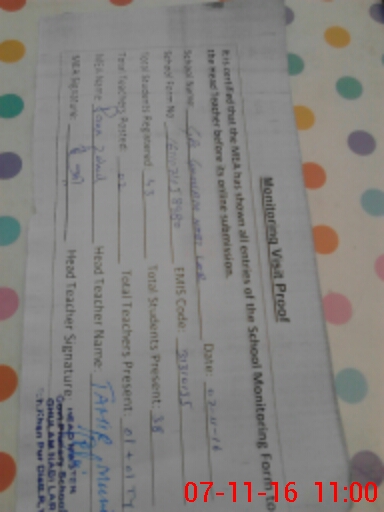 | Monitoring Date: 07-11-2016 | Start Time: 07-11-2016 10:48 AM | End Time: 07-11-2016 11:02 AM | Name of MEA: Mu**** Za**** -KP**** | |