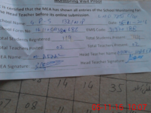 | Attendance Register | Head Teacher | MEA with School | Visit Proof |