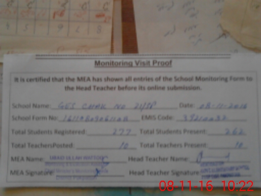| Attendance Register | Head Teacher | MEA with School | Visit Proof |