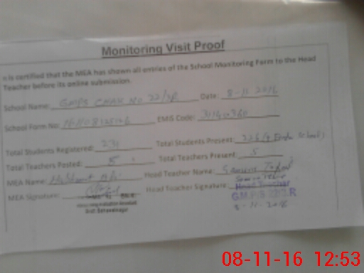 | Attendance Register | Head Teacher | MEA with School | Visit Proof |
