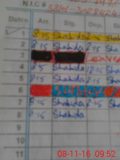 | CNIC | Full Name | Designation | R/C | Absence During Last Calender Month |
