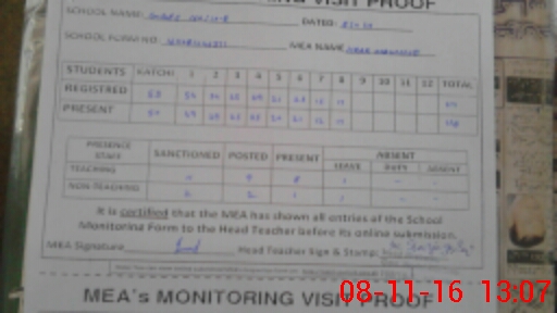 | Attendance Register | Head Teacher | MEA with School | Visit Proof |