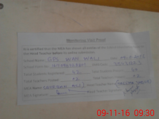 | Attendance Register | Head Teacher | MEA with School | Visit Proof |