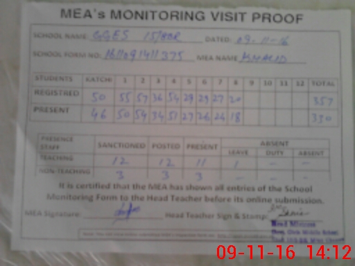 | Attendance Register | Head Teacher | MEA with School | Visit Proof |