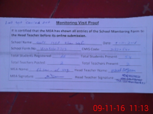 | Attendance Register | Head Teacher | MEA with School | Visit Proof |