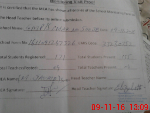 | Attendance Register | Head Teacher | MEA with School | Visit Proof |