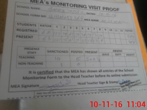 | Attendance Register | Head Teacher | MEA with School | Visit Proof |