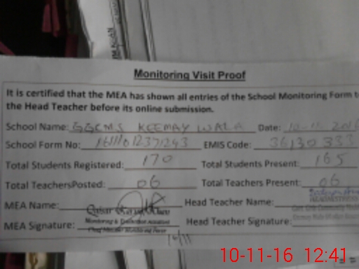 | Attendance Register | Head Teacher | MEA with School | Visit Proof |
