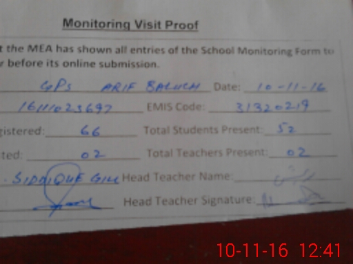 | EMIS Code: 31320219 | Name of School: GPS AARIF BLOCH | |||