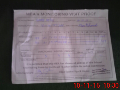 | Attendance Register | Head Teacher | MEA with School | Visit Proof |