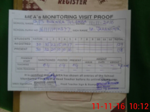 | Attendance Register | Head Teacher | MEA with School | Visit Proof |