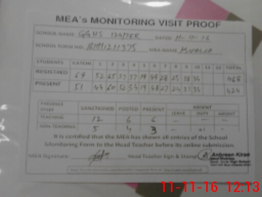 | Attendance Register | Head Teacher | MEA with School | Visit Proof |
