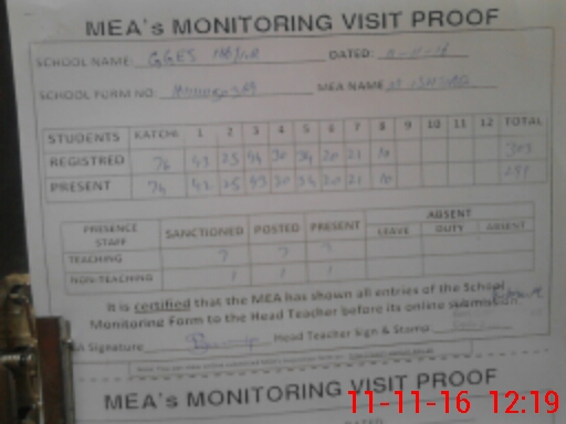 | Attendance Register | Head Teacher | MEA with School | Visit Proof |