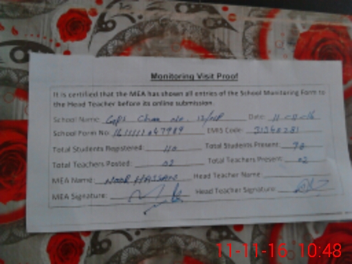 | Attendance Register | Head Teacher | MEA with School | Visit Proof |