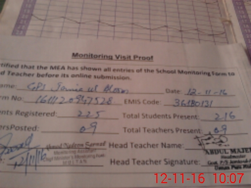 | EMIS Code: 36130131 | Name of School: GPS JAMI UL ALOOM DOULAT GATE MULTAN | |||