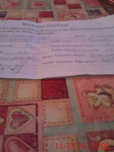 | Attendance Register | Head Teacher | MEA with School | Visit Proof |