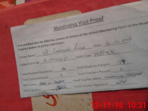 | Attendance Register | Head Teacher | MEA with School | Visit Proof |