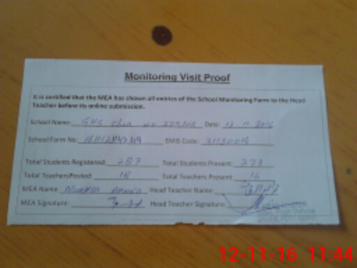 | Attendance Register | Head Teacher | MEA with School | Visit Proof |