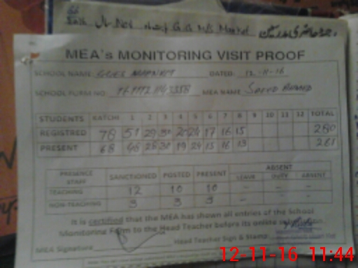 | Attendance Register | Head Teacher | MEA with School | Visit Proof |