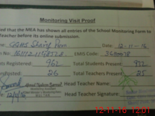 | EMIS Code: 36110078 | Name of School: GGHS SHARIF PURA MULTAN | |||
