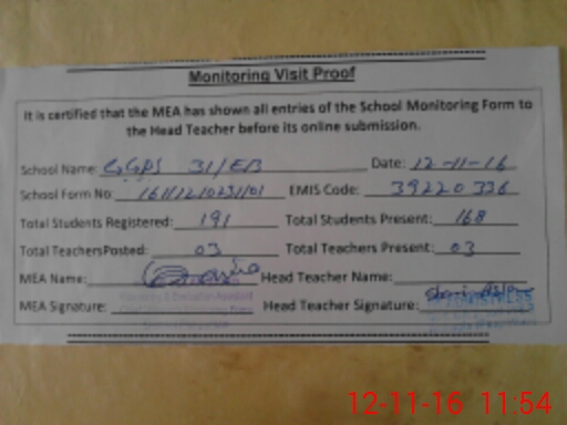 | Attendance Register | Head Teacher | MEA with School | Visit Proof |