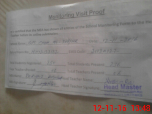 | Attendance Register | Head Teacher | MEA with School | Visit Proof |